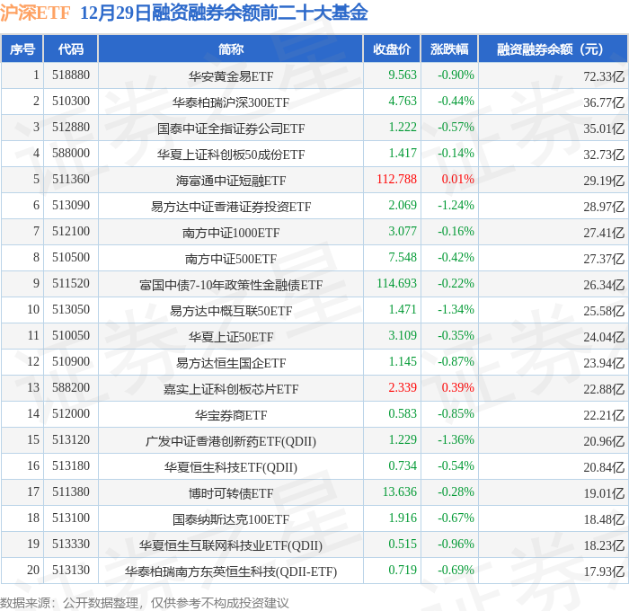 沪深ETF融资融券余额前三分别为:华安黄金易ETF(518880)融资融券余额72.33亿元、华泰柏瑞沪深300ETF(510300)融资融券余额36.77亿元、国泰中证全指证券公司ETF(512880)融资融券余额35.01亿元,前20具体见下表: