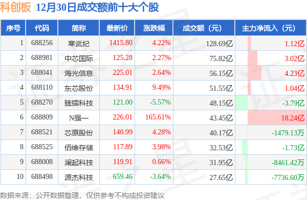当日科创板成交额前10大个股中8只个股收涨,平均涨幅24.14%,其中寒武纪(688256)以成交额128.69亿元排第一。从主力资金流入看,成交额前10大个股中有5只个股呈现主力资金净流入。