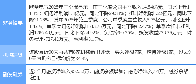 2025年10月29日,国金证券研究员赵中平,王刚,蔡润泽发布了对欧圣电气的研报《营收恢复正增长,盈利短期承压》,该研报对欧圣电气给出“买入”评级。研报中预计公司25-27年归母净利润分别为1.9亿、3.1亿、4.6亿,同比-25.5%、+66.5%、+47.1%,对应PE分别为39、23、16倍,维持“买入”评级。证券之星数据中心根据近三年发布的研报数据计算,该研报作者对此股的盈利预测准确度为74.33%。