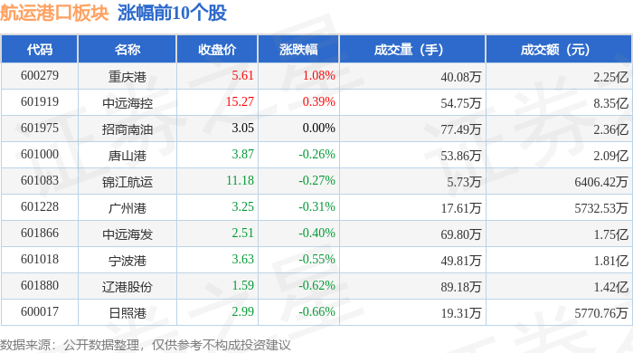 证券之星消息,12月30日航运港口板块较上一交易日下跌1.18%,安通控股领跌。当日上证指数报收于3965.12,下跌0.0%。深证成指报收于13604.07,上涨0.49%。航运港口板块个股涨跌见下表: