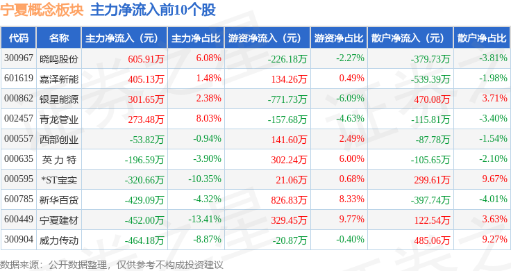 从资金流向上来看,当日宁夏概念板块主力资金净流出1.27亿元,游资资金净流出751.55万元,散户资金净流入1.35亿元。宁夏概念板块个股资金流向见下表: