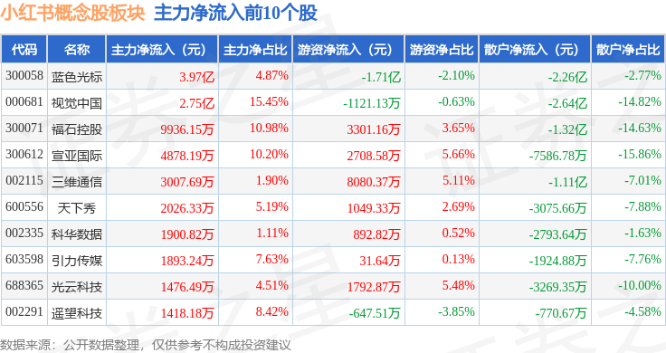 从资金流向上来看,当日小红书概念股板块主力资金净流入9.34亿元,游资资金净流出169.2万元,散户资金净流出9.32亿元。小红书概念股板块个股资金流向见下表:
