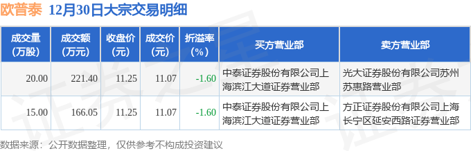 证券之星消息,12月30日欧普泰发生大宗交易,交易数据如下: