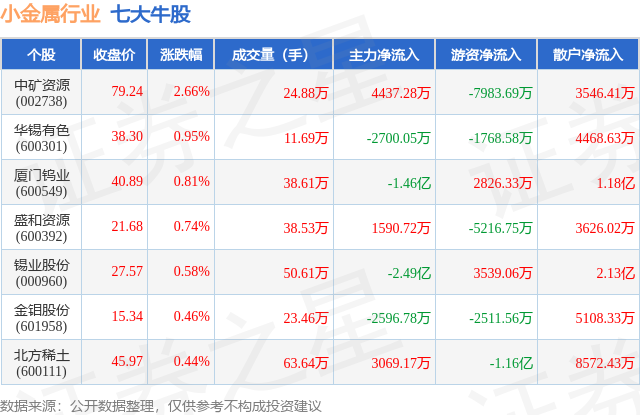 个股表现方面,小金属行业当日领涨股为中矿资源(002738),该股当日报收79.24,上涨2.66%,成交量24.88万,主力资金净流入4437.28万元。华锡有色(600301)以上涨0.95%紧随其后,该股当日成交量11.69万,主力资金净流出2700.05万元。除此之外,厦门钨业(600549)、盛和资源(600392)、锡业股份(000960)均进入当日牛股之列。具体个股列表见下表: