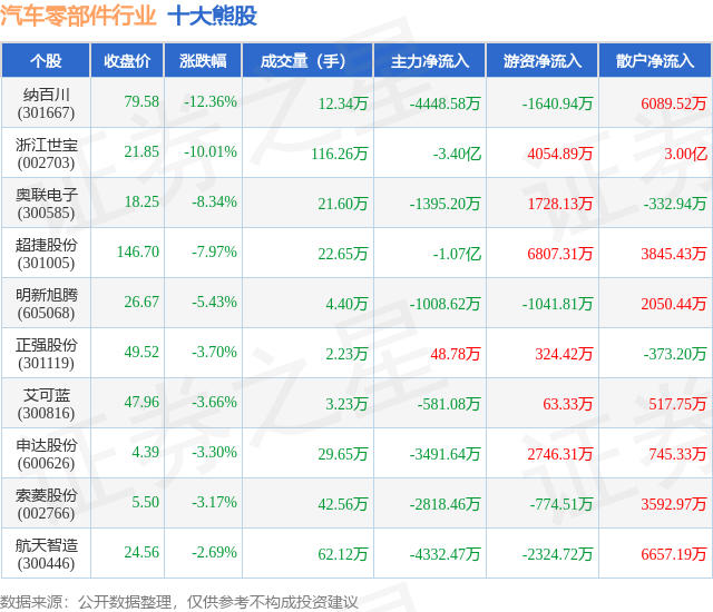 个股表现方面,汽车零部件行业当日领跌股为纳百川(301667),该股当日报收79.58,下跌12.36%,成交量12.34万,主力资金净流出4448.58万元。浙江世宝(002703)以下跌10.01%紧随其后,该股当日成交量116.26万,主力资金净流出3.4亿元。除此之外,奥联电子(300585)、超捷股份(301005)、明新旭腾(605068)均进入当日熊股之列。具体个股列表见下表: