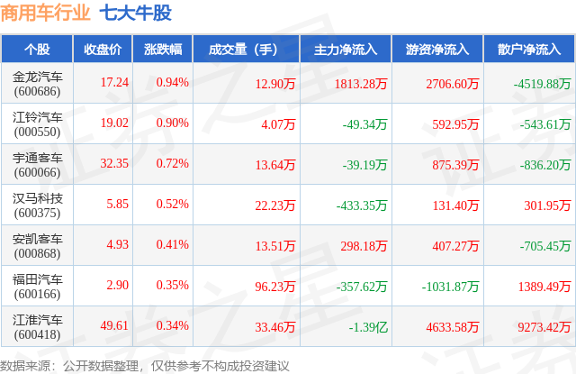 个股表现方面,商用车行业当日领涨股为金龙汽车(600686),该股当日报收17.24,上涨0.94%,成交量12.9万,主力资金净流入1813.28万元。江铃汽车(000550)以上涨0.9%紧随其后,该股当日成交量4.07万,主力资金净流出49.34万元。除此之外,宇通客车(600066)、汉马科技(600375)、安凯客车(000868)均进入当日牛股之列。具体个股列表见下表: