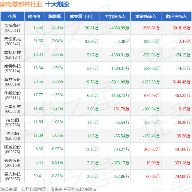 个股表现方面,家电零部件行业当日领跌股为金海高科(603311),该股当日报收15.62,下跌5.51%,成交量20.81万,主力资金净流出4956.99万元。天银机电(300342)以下跌2.64%紧随其后,该股当日成交量93.29万,主力资金净流出2.38亿元。除此之外,南特科技(920124)、南特科技(920124)、海立股份(600619)均进入当日熊股之列。具体个股列表见下表: