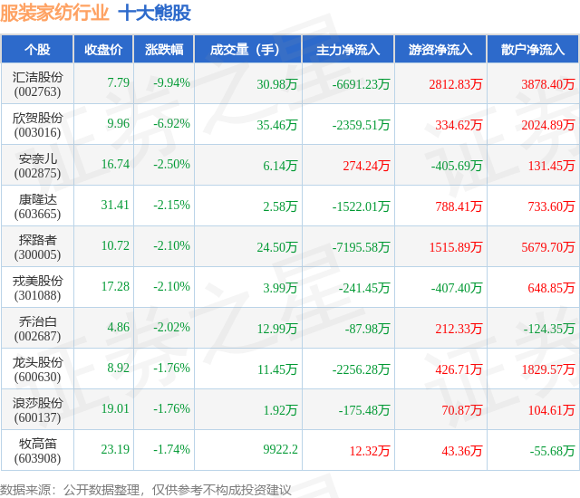 个股表现方面,服装家纺行业当日领跌股为汇洁股份(002763),该股当日报收7.79,下跌9.94%,成交量30.98万,主力资金净流出6691.23万元。欣贺股份(003016)以下跌6.92%紧随其后,该股当日成交量35.46万,主力资金净流出2359.51万元。除此之外,安奈儿(002875)、康隆达(603665)、探路者(300005)均进入当日熊股之列。具体个股列表见下表: