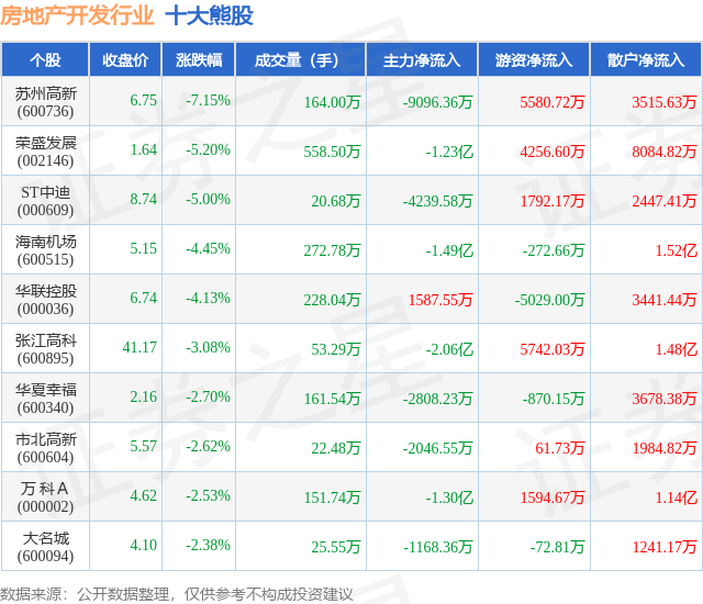 个股表现方面,房地产开发行业当日领跌股为苏州高新(600736),该股当日报收6.75,下跌7.15%,成交量164.0万,主力资金净流出9096.36万元。荣盛发展(002146)以下跌5.2%紧随其后,该股当日成交量558.5万,主力资金净流出1.23亿元。除此之外,ST中迪(000609)、海南机场(600515)、华联控股(000036)均进入当日熊股之列。具体个股列表见下表: