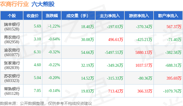 个股表现方面,农商行行业当日领跌股为瑞丰银行(601528),该股当日报收5.69,下跌1.22%,成交量18.4万,主力资金净流出197.03万元。青农商行(002958)以下跌0.64%紧随其后,该股当日成交量30.08万,主力资金净流入496.61万元。除此之外,渝农商行(601077)、张家港行(002839)、苏农银行(603323)均进入当日熊股之列。具体个股列表见下表: