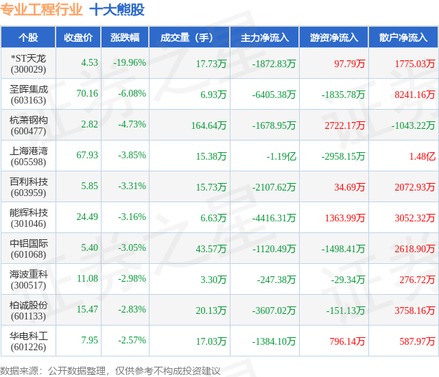 个股表现方面,专业工程行业当日领跌股为*ST天龙(300029),该股当日报收4.53,下跌19.96%,成交量17.73万,主力资金净流出1872.83万元。圣晖集成(603163)以下跌6.08%紧随其后,该股当日成交量6.93万,主力资金净流出6405.38万元。除此之外,杭萧钢构(600477)、上海港湾(605598)、百利科技(603959)均进入当日熊股之列。具体个股列表见下表: