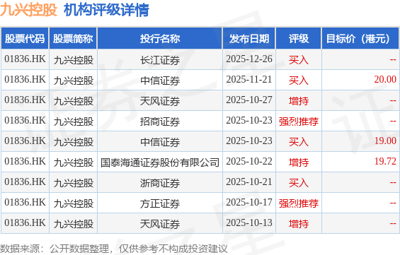 截至2025年12月30日收盘,九兴控股(01836.HK)报收于15.15港元,下跌0.66%,成交量57.24万股,成交额866.53万港元。投行对该股的评级以买入为主,近90天内共有4家投行给出买入评级,近90天的目标均价为19.57港元。长江证券最新一份研报给予九兴控股买入评级。