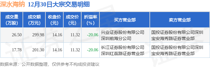 证券之星消息,12月30日深水海纳发生大宗交易,交易数据如下: