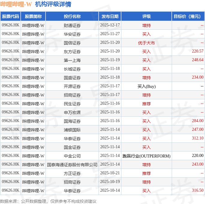 截至2025年12月30日收盘,哔哩哔哩-W(09626.HK)报收于192.1港元,上涨0.68%,成交量242.02万股,成交额4.65亿港元。投行对该股的评级以买入为主,近90天内共有10家投行给出买入评级,近90天的目标均价为258.42港元。财通证券最新一份研报给予哔哩哔哩-W增持评级。