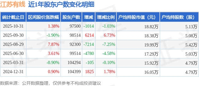 从股价来看,2025年9月30日至2025年10月31日,江苏有线区间涨幅为1.38%,在此期间股东户数减少1014.0户,减幅为1.03%。