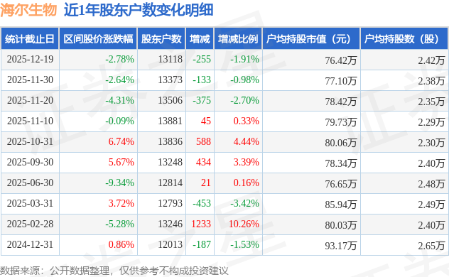从股价来看,2025年11月30日至2025年12月19日,海尔生物区间跌幅为2.78%,在此期间股东户数减少255.0户,减幅为1.91%。