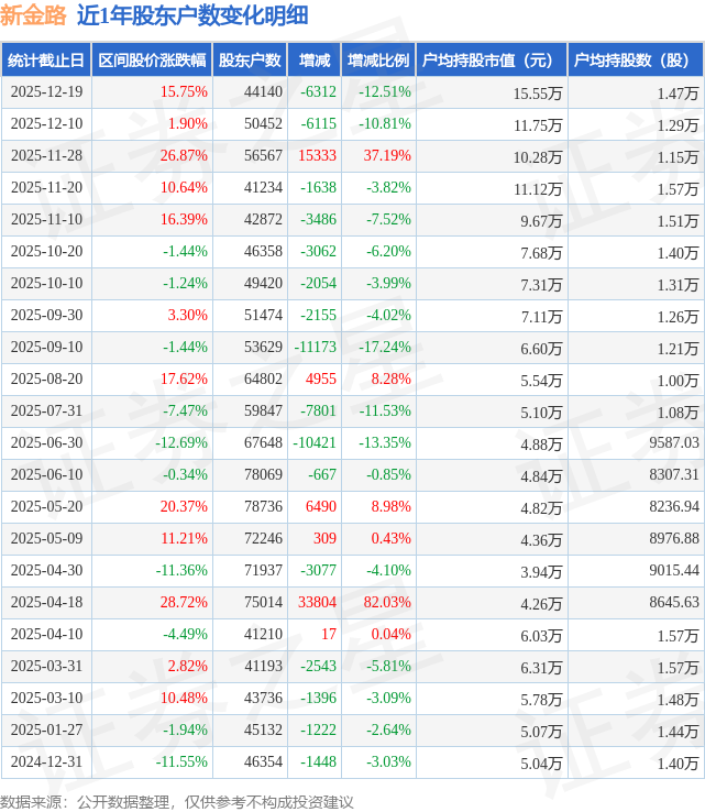 从股价来看,2025年12月10日至2025年12月19日,新金路区间涨幅为15.75%,在此期间股东户数减少6312.0户,减幅为12.51%。