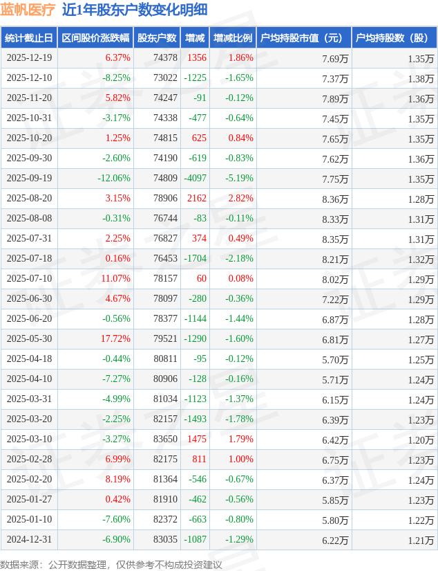 从股价来看,2025年12月10日至2025年12月19日,蓝帆医疗区间涨幅为6.37%,在此期间股东户数增加1356.0户,增幅为1.86%。