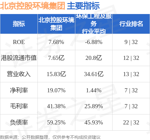 北京控股环境集团港股市值7.65亿港元,在环保工程及服务行业中排名第12。主要指标见下表: