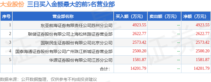 证券之星消息,沪深交易所2025年12月30日公布的交易公开信息显示,大业股份(603278)因非ST、*ST和S证券连续三个交易日内收盘价格涨幅偏离值累计达到20%的证券登上龙虎榜。此次是近5个交易日内第3次上榜。