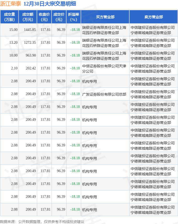 证券之星消息,12月30日浙江荣泰发生大宗交易,交易数据如下: