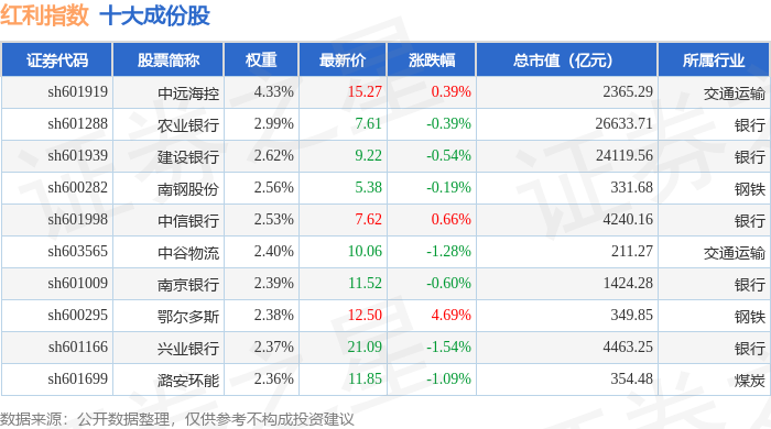 证券之星消息,12月30日,红利指数(000015)报收于3043.15点,跌0.07%,成交312.83亿元,换手率0.23%。当日该指数成份股中,上涨的有16家,鄂尔多斯以4.69%的涨幅领涨,下跌的有33家,厦门国贸以5.86%的跌幅领跌。