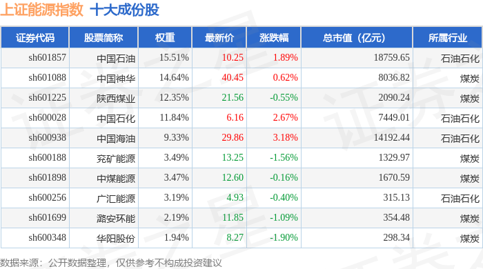 上证能源(000032)指数十大成份股详情如下: