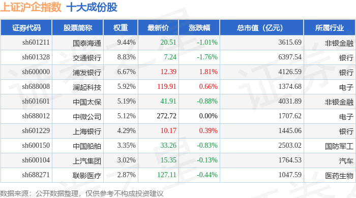 上证沪企(000062)指数十大成份股详情如下:
