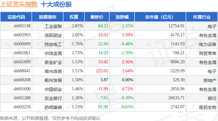 证券之星消息,12月30日,上证龙头(000065)指数报收于3591.03点,跌0.33%,成交1396.48亿元,换手率0.39%。当日该指数成份股中,上涨的有23家,恒力石化以6.81%的涨幅领涨,下跌的有68家,永辉超市以6.46%的跌幅领跌。