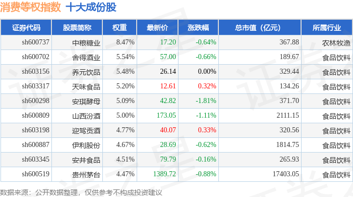 证券之星消息,12月30日,消费等权(000074)指数报收于7084.25点,跌0.26%,成交119.44亿元,换手率0.75%。当日该指数成份股中,上涨的有9家,丸美生物以2.6%的涨幅领涨,下跌的有19家,海南橡胶以3.11%的跌幅领跌。