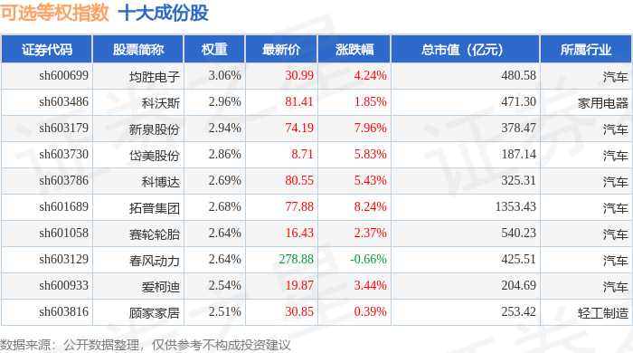 证券之星消息,12月30日,可选等权(000073)指数报收于3522.93点,涨1.02%,成交351.98亿元,换手率1.63%。当日该指数成份股中,上涨的有24家,浙江荣泰以10.0%的涨幅领涨,下跌的有26家,永辉超市以6.46%的跌幅领跌。