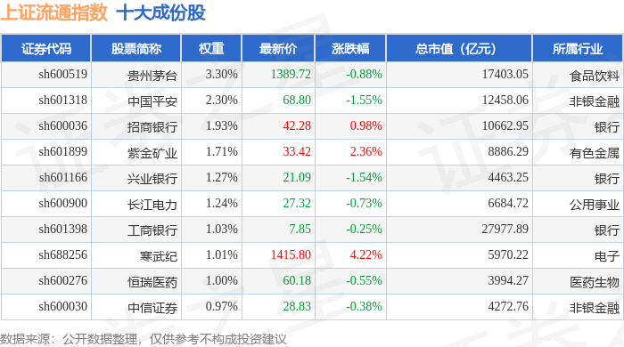 证券之星消息,12月30日,上证流通(000090)指数报收于1446.54点,涨0.01%,成交8703.22亿元,换手率1.1%。当日该指数成份股中,上涨的有736家,步科股份以20.0%的涨幅领涨,下跌的有1413家,上纬新材以10.19%的跌幅领跌。