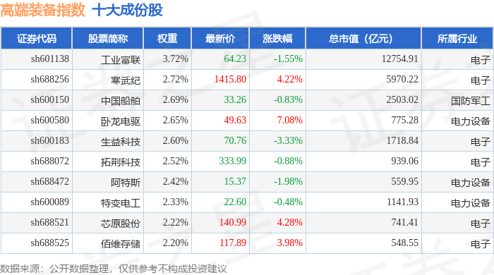证券之星消息,12月30日,高端装备(000097)指数报收于11510.07点,涨0.25%,成交1521.88亿元,换手率1.67%。当日该指数成份股中,上涨的有28家,拓普集团以8.24%的涨幅领涨,下跌的有31家,兆易创新以3.38%的跌幅领跌。