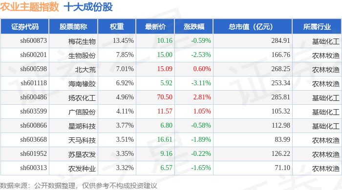 证券之星消息,12月30日,农业主题(000122)指数报收于1632.69点,跌0.48%,成交52.24亿元,换手率1.9%。当日该指数成份股中,上涨的有9家,扬农化工以2.81%的涨幅领涨,下跌的有23家,海南橡胶以3.11%的跌幅领跌。