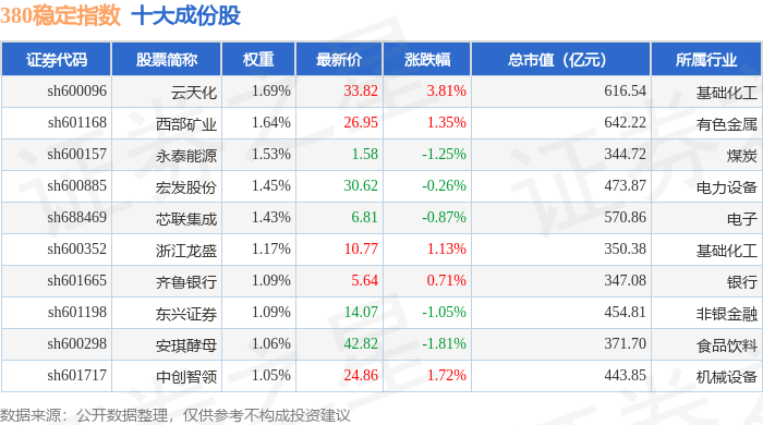 证券之星消息,12月30日,380稳定(000142)指数报收于9857.24点,涨0.06%,成交524.71亿元,换手率0.99%。当日该指数成份股中,上涨的有72家,岱美股份以5.83%的涨幅领涨,下跌的有109家,九丰能源以7.23%的跌幅领跌。