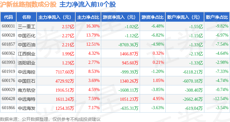 资金流向方面,沪新丝路(000160)指数成份股当日主力资金净流出合计17.88亿元,游资资金净流入合计3.88亿元,散户资金净流入合计13.99亿元。成份股资金流向详情见下表:
