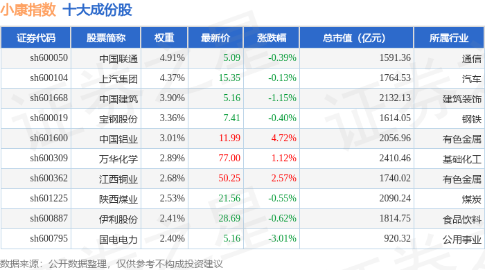 证券之星消息,12月30日,小康指数(000901)报收于6338.81点,跌0.1%,成交916.03亿元,换手率0.57%。当日该指数成份股中,上涨的有27家,恒力石化以6.81%的涨幅领涨,下跌的有73家,华能国际以3.78%的跌幅领跌。