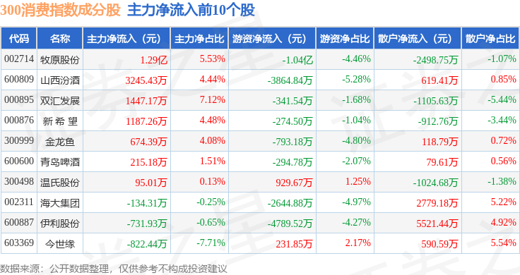 资金流向方面,300消费(000912)指数成份股当日主力资金净流出合计9.99亿元,游资资金净流入合计6.38亿元,散户资金净流入合计3.61亿元。成份股资金流向详情见下表: