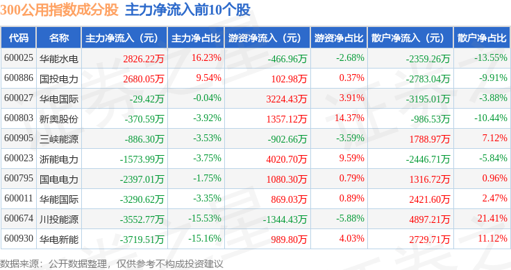 资金流向方面,300公用(000917)指数成份股当日主力资金净流出合计3.85亿元,游资资金净流入合计9256.35万元,散户资金净流入合计2.92亿元。成份股资金流向详情见下表: