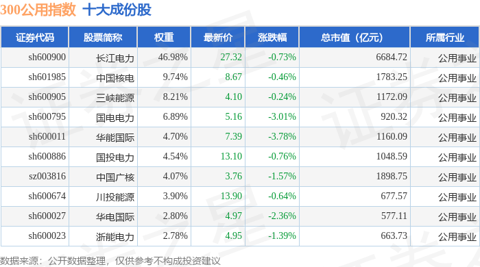 300公用(000917)指数十大成份股详情如下: