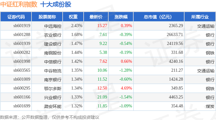 证券之星消息,12月30日,中证红利(000922)指数报收于5499.21点,跌0.05%,成交560.63亿元,换手率0.28%。当日该指数成份股中,上涨的有37家,鄂尔多斯以4.69%的涨幅领涨,下跌的有57家,厦门国贸以5.86%的跌幅领跌。