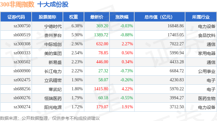 证券之星消息,12月30日,300非周(000969)指数报收于5374.2点,涨0.32%,成交3317.06亿元,换手率0.89%。当日该指数成份股中,上涨的有84家,三花智控以9.99%的涨幅领涨,下跌的有108家,华能国际以3.78%的跌幅领跌。