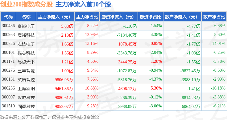 资金流向方面,创业200(399019)指数成份股当日主力资金净流出合计19.99亿元,游资资金净流入合计6.4亿元,散户资金净流入合计13.6亿元。成份股资金流向详情见下表: