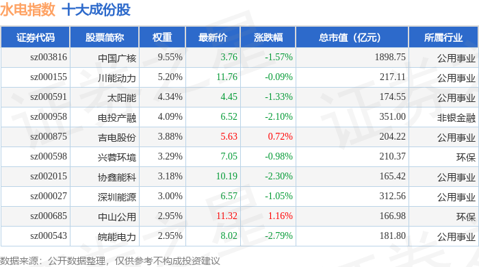 水电指数(399234)十大成份股详情如下: