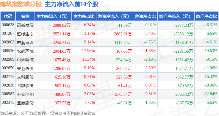 资金流向方面,建筑指数(399235)成份股当日主力资金净流出合计6.31亿元,游资资金净流入合计9767.32万元,散户资金净流入合计5.33亿元。成份股资金流向详情见下表: