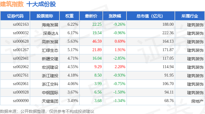 证券之星消息,12月30日,建筑指数(399235)报收于1089.61点,跌1.81%,成交109.03亿元,换手率2.38%。当日该指数成份股中,上涨的有6家,宏润建设以2.2%的涨幅领涨,下跌的有32家,海南发展以9.26%的跌幅领跌。