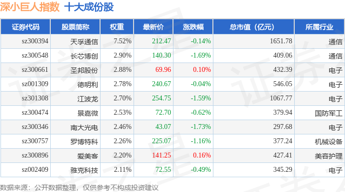 深小巨人(399268)指数十大成份股详情如下: