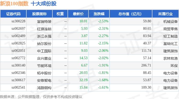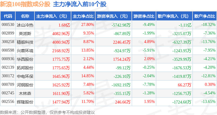 资金流向方面,新浪100(399297)指数成份股当日主力资金净流出合计2.35亿元,游资资金净流入合计1.17亿元,散户资金净流入合计1.18亿元。成份股资金流向详情见下表: