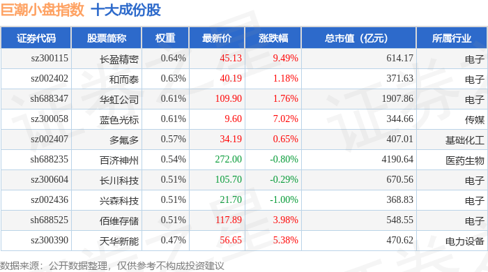 巨潮小盘(399316)指数十大成份股详情如下: