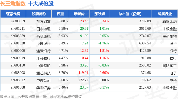 证券之星消息,12月30日,长三角(399355)指数报收于3694.85点,涨0.41%,成交593.22亿元,换手率0.62%。当日该指数成份股中,上涨的有18家,三花智控以9.99%的涨幅领涨,下跌的有21家,沪电股份以2.8%的跌幅领跌。
